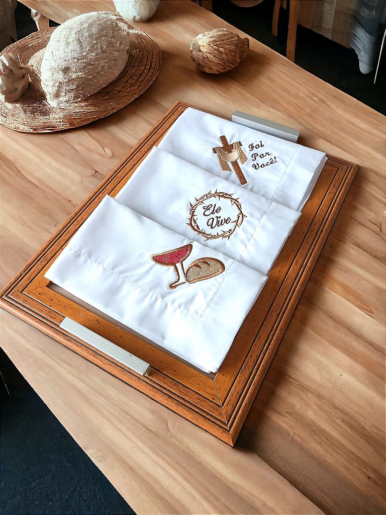 Os guardanapos cristãos em tricoline 100% algodão são mais do que simples acessórios de mesa - eles carregam consigo uma mensagem de fé e significado. Cada bordado, seja a cruz com a poderosa frase "Foi por você", o desenho do pão e do vinho simbolizando a comunhão, ou a coroa de espinhos com a inspiradora mensagem "Ele vive", traz consigo uma emoção profunda e um convite à reflexão. Ao serem dispostos à mesa, esses guardanapos não apenas enfeitam o ambiente, mas também convidam à contemplação e à conexão espiritual. São peças que, ao serem utilizadas, lembram-nos da presença constante da fé em nossas vidas, tornando cada refeição um momento sagrado e especial.
